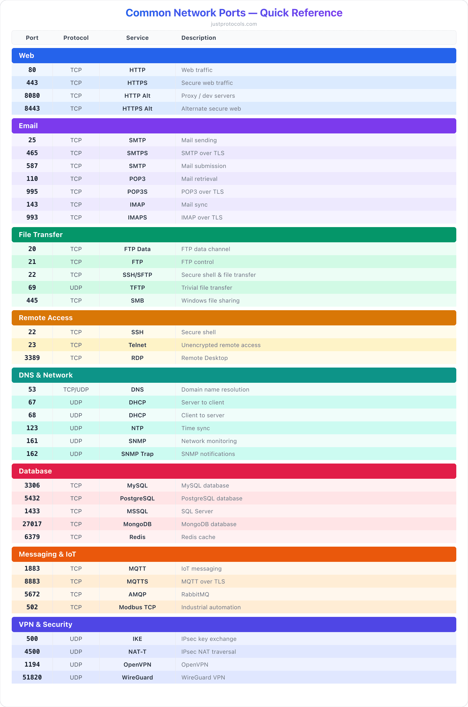 A quick-reference guide to the most commonly used network port numbers — organized by category with port, protocol, service name, and description.